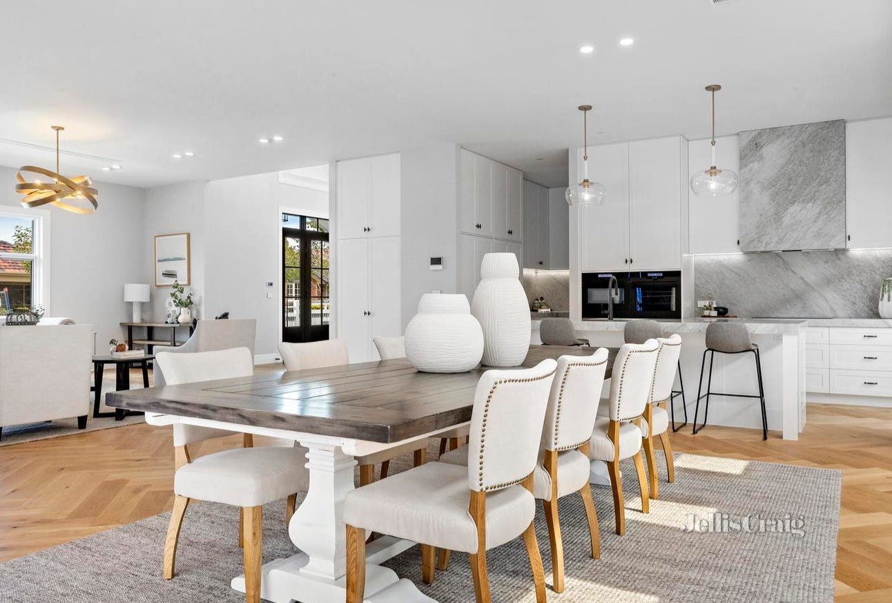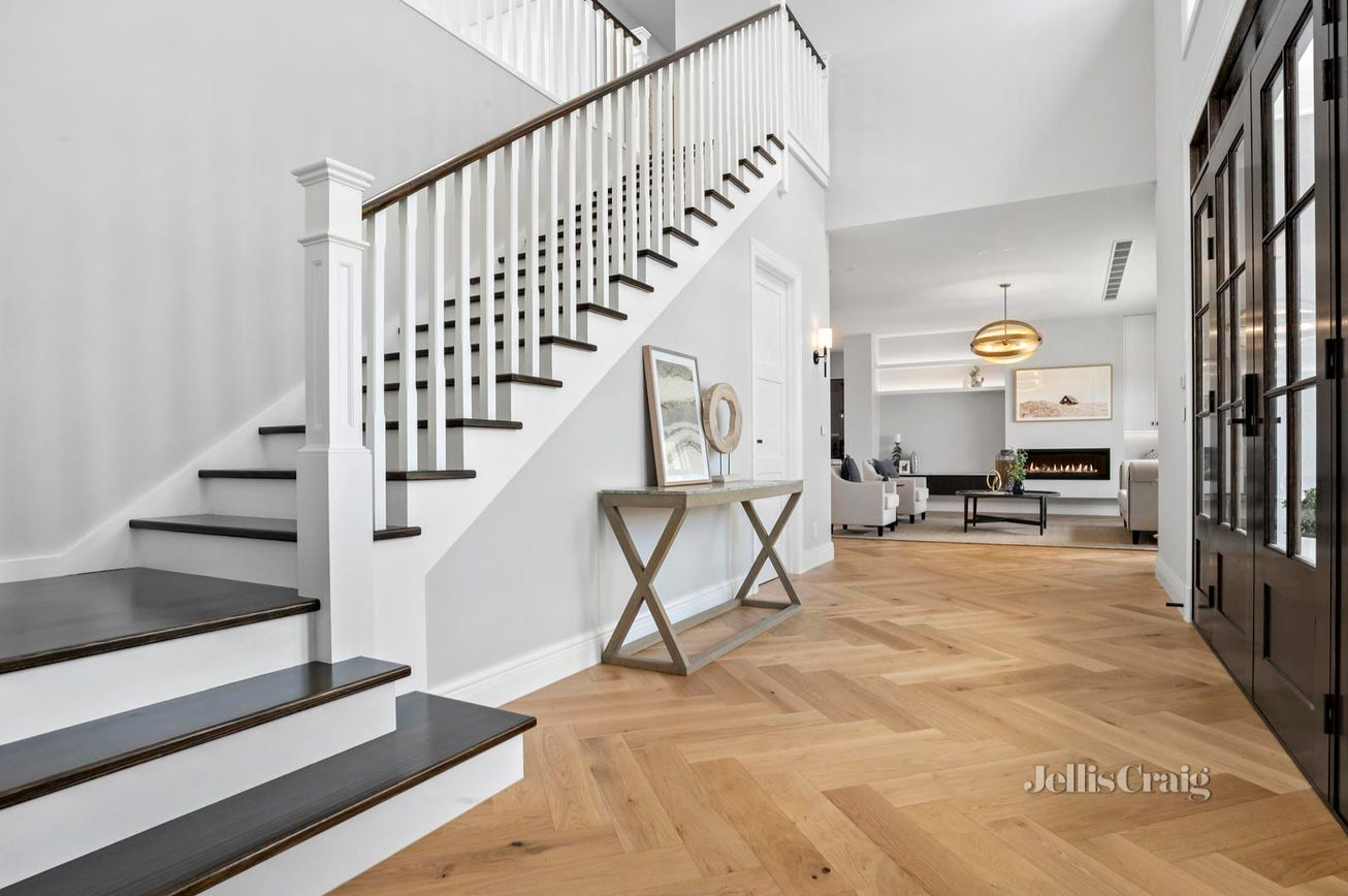 A spectacular 6m high entry and stunning European Oak flooring introduce this grand-scale home, with a refined formal Lounge accompanying a spacious open-plan skylit Living/Dining zone with gas log fireplace.